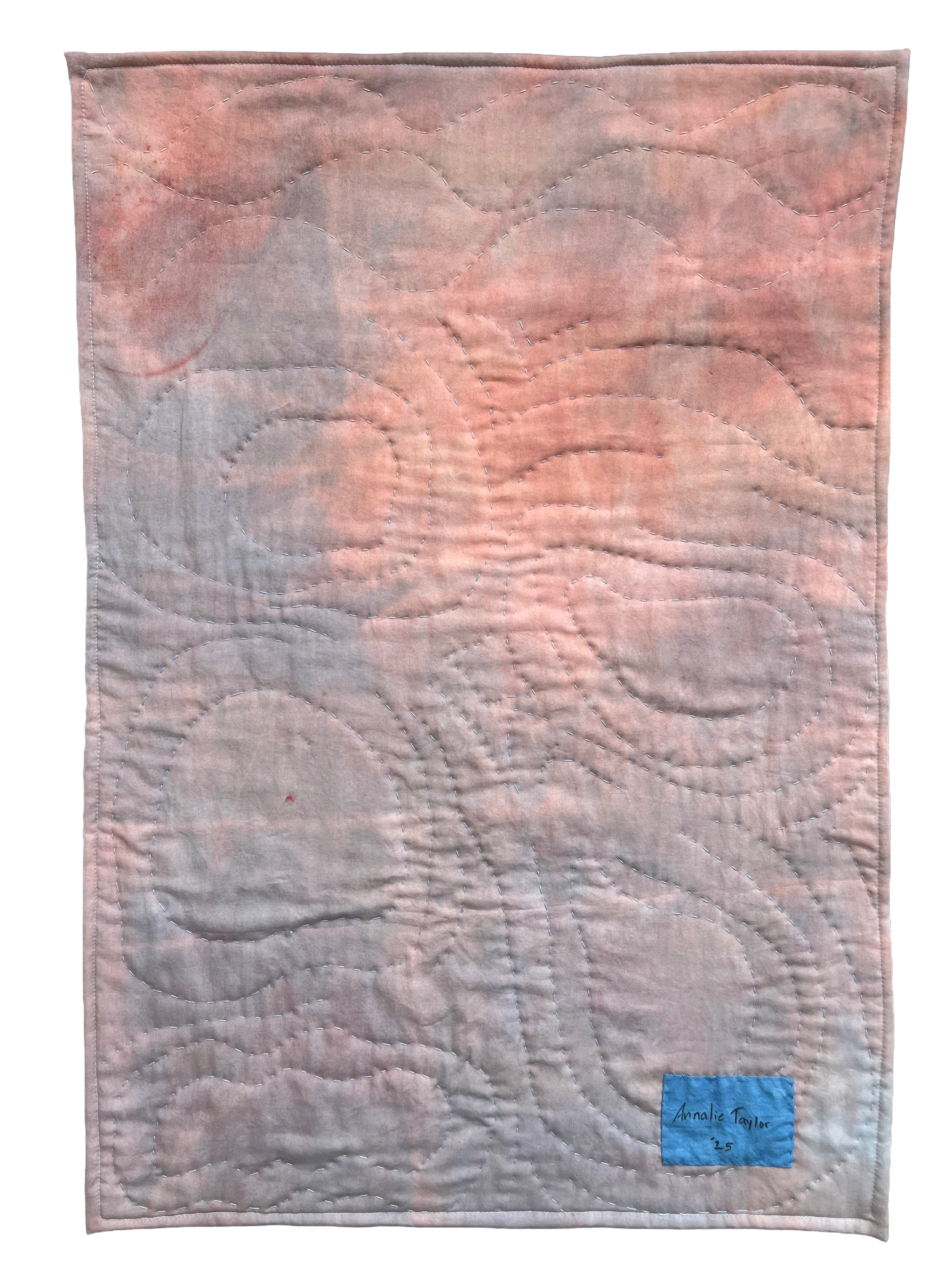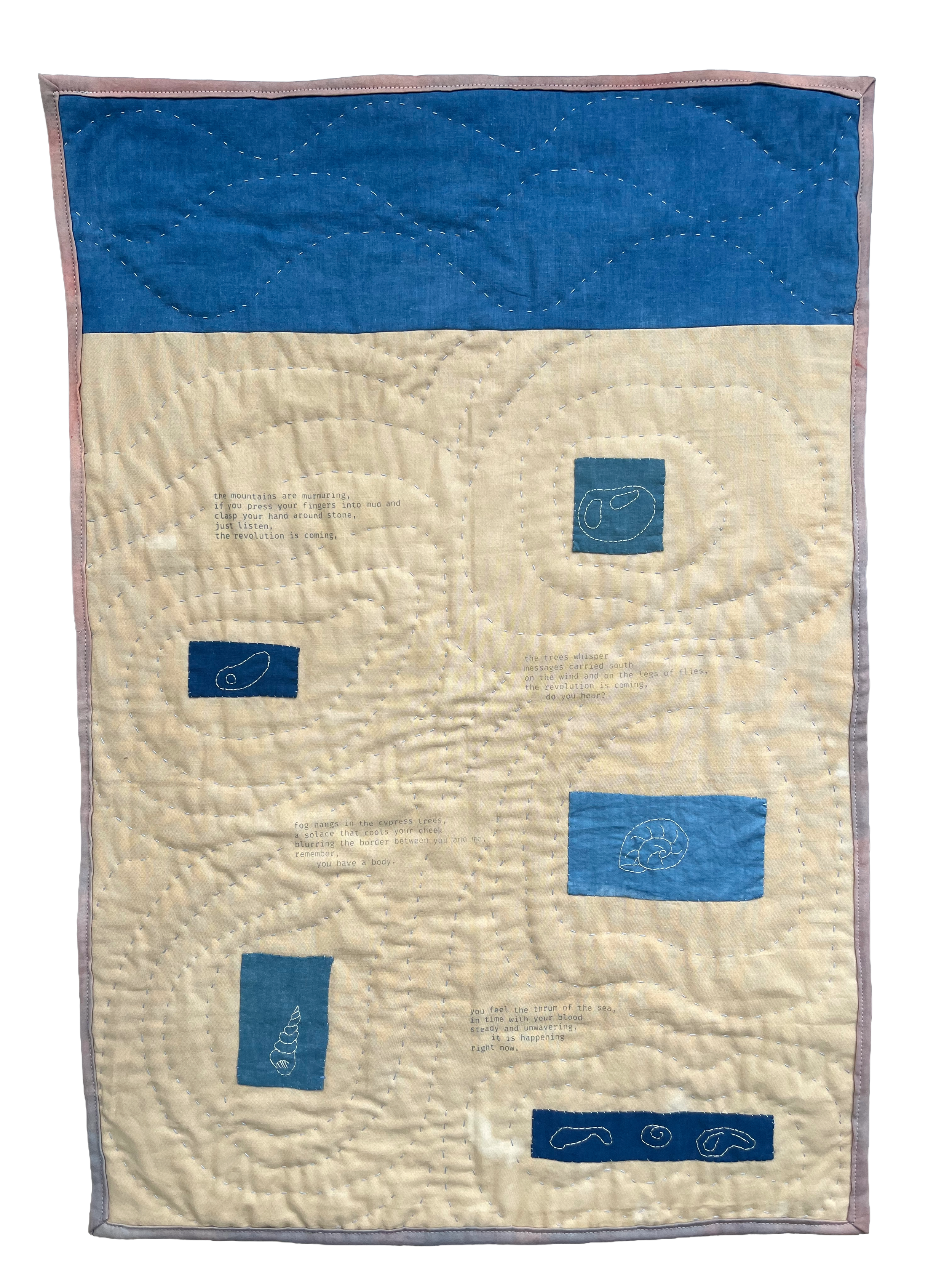 9x26” Hand-quilted with repurposed fabrics dyed with indigo, oak galls,and madder root, screen printed with indigo pigment